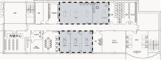 集中布置:是將呼吸系統(tǒng)、消化系統(tǒng)、泌尿系統(tǒng)的內(nèi)鏡診斷和治療的空間集中設(shè)置在一個(gè)合理的區(qū)域。其平面除了布置除各種性質(zhì)相近的檢查室相對集中外,還需要配備常用的輔助檢查室,如準(zhǔn)備、處置、庫房、灌腸、洗滌、辦公等用房。